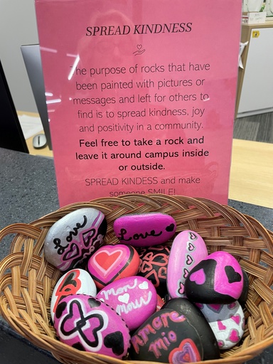 Suchomel also enjoys spreading kindness. Earlier this spring, she initiated a campaign where she painted rocks with various messages and designs. They were put in a basket in the Office of the Dean’s suite welcome area, encouraging people to take one and place it somewhere in the college or on campus. Her mission of bringing joy to others was ultimately fulfilled.
