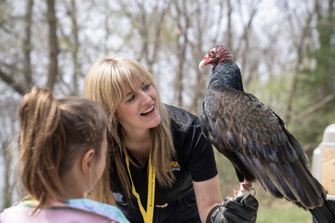 Assistant Director Katie Ibsen shows little girl Shiloh, a Turkey Vulture, during the IRP 40th birthday party